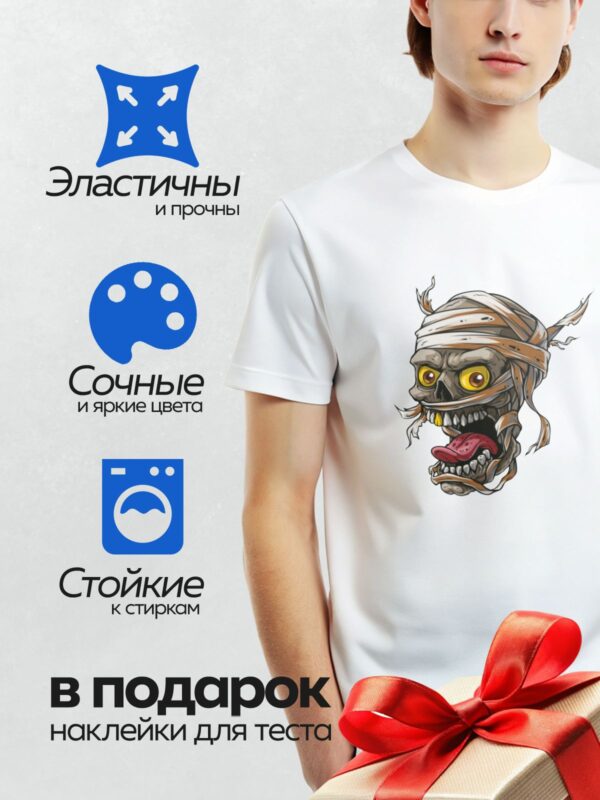 Термонаклейка на одежду DTF / Череп мумии с жёлтыми глазами и высунутым языком.
