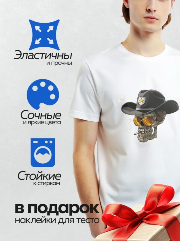 Термонаклейка на одежду DTF / Череп в ковбойской шляпе, с очками и сигаретой.