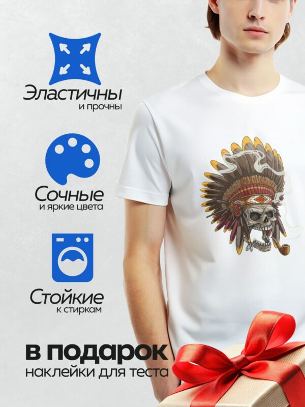 Термонаклейка на одежду DTF / Череп в индейском головном уборе с трубкой.