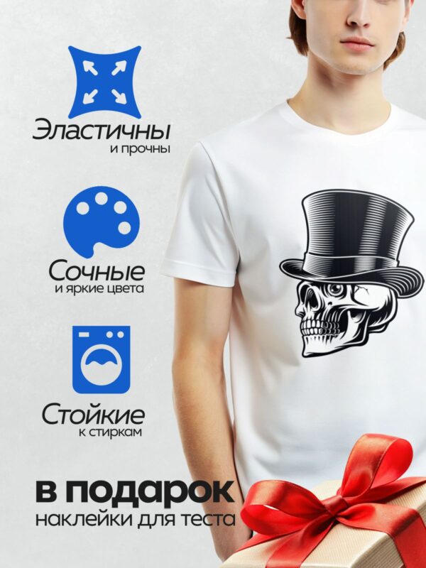 Термонаклейка на одежду DTF / Череп в цилиндре, стилизованный, черно-белый.
