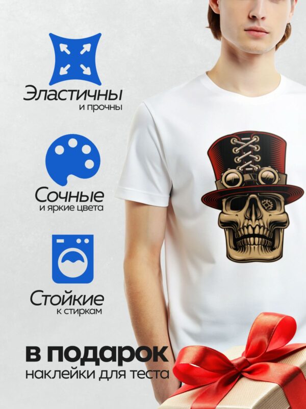 Термонаклейка на одежду DTF / Стилизованный череп в цилиндре с очками.