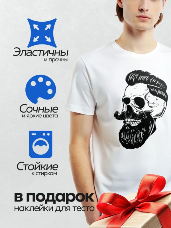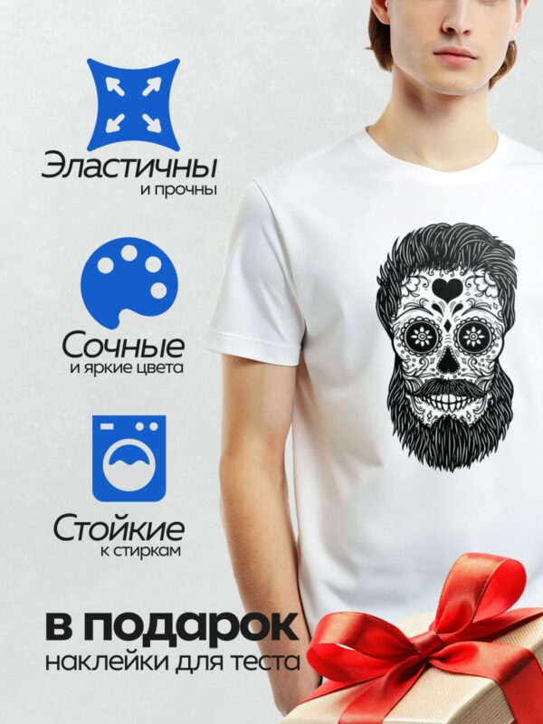 Термонаклейка на одежду DTF / Стилизованный мексиканский череп с бородой и усами.