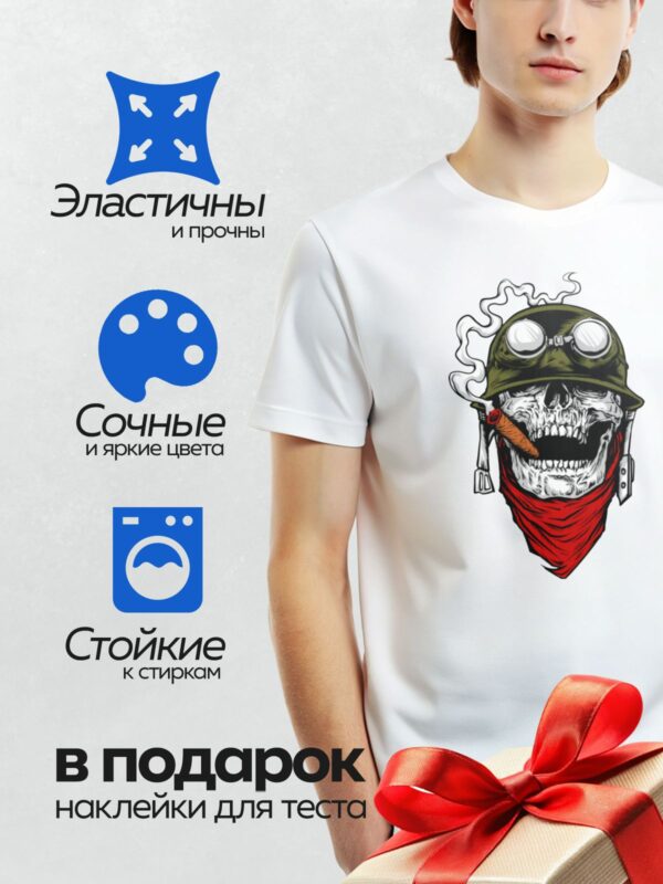 Термонаклейка на одежду DTF / Череп в военной каске, с сигарой и банданой.
