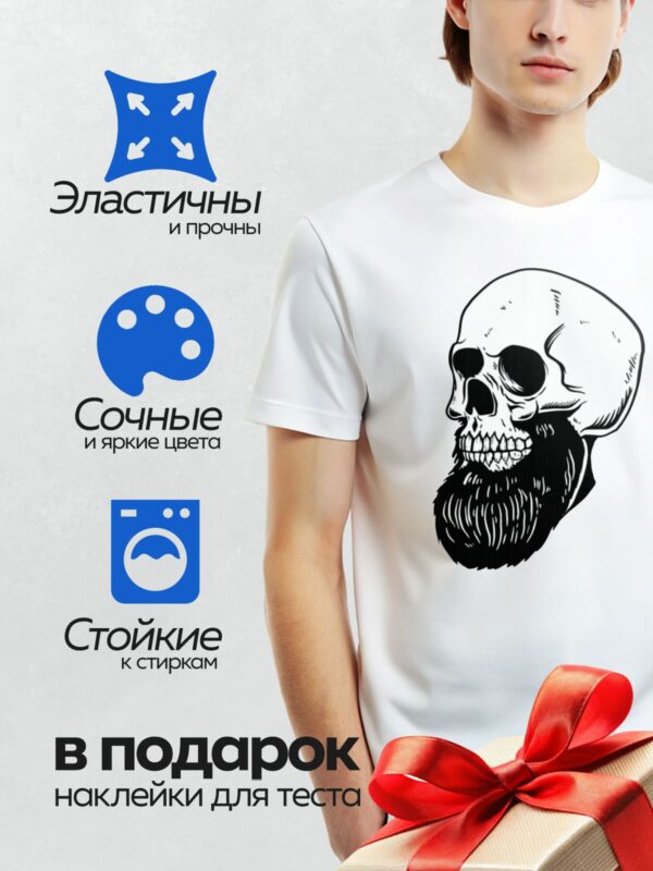 Термонаклейка на одежду DTF / Стилизованный череп с густой бородой в черно-белом стиле.