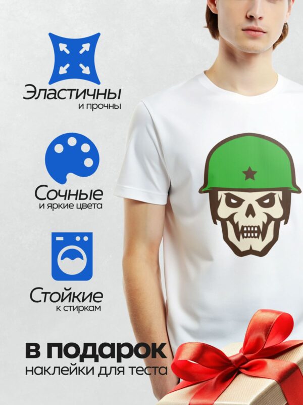 Термонаклейка на одежду DTF / Череп в зеленой военной каске с черной звездой.