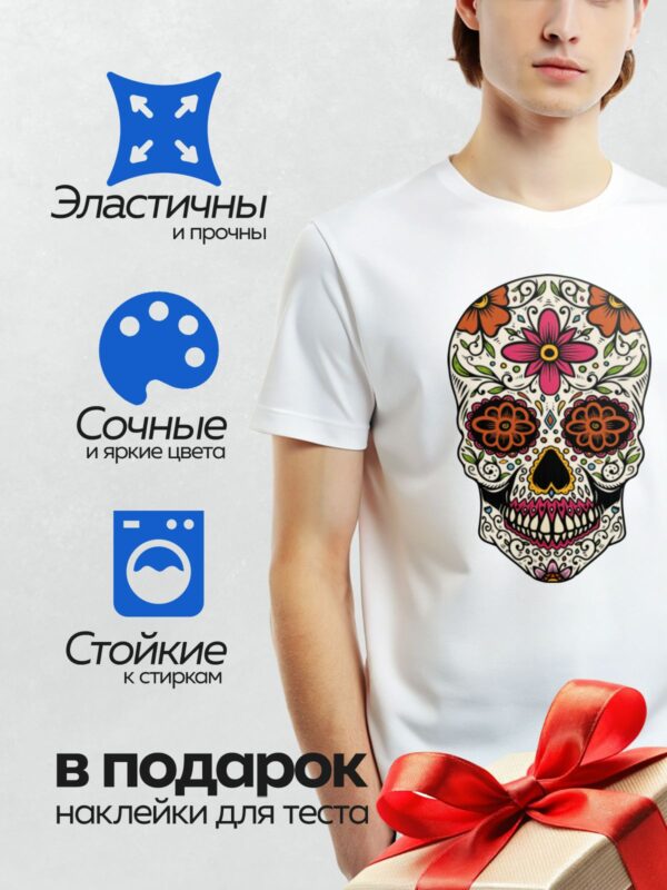 Термонаклейка на одежду DTF / Яркий мексиканский череп с цветами и узорами.