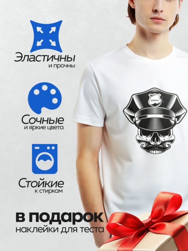 Термонаклейка на одежду DTF / Череп в полицейской шляпе с усами и значком шерифа.