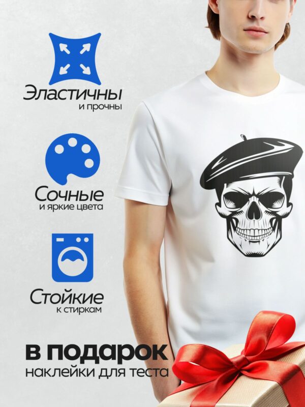 Термонаклейка на одежду DTF / Череп в берете, выполненный в черно-белом стиле.
