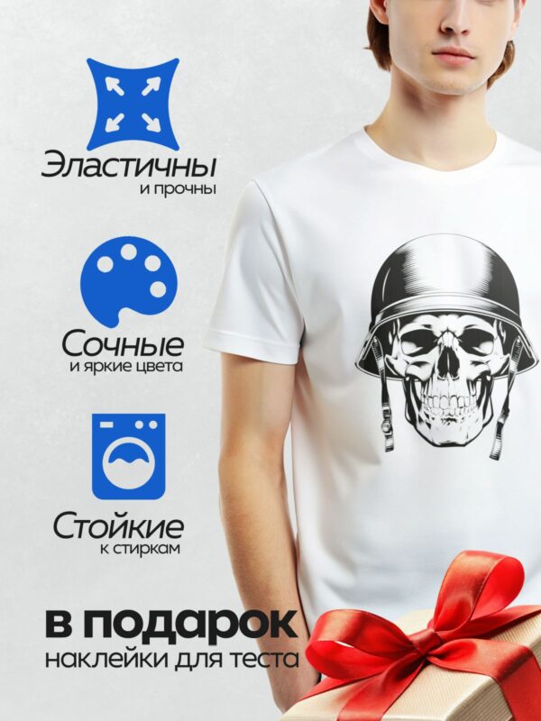 Термонаклейка на одежду DTF / Черно-белый череп в военной каске, детализированный.