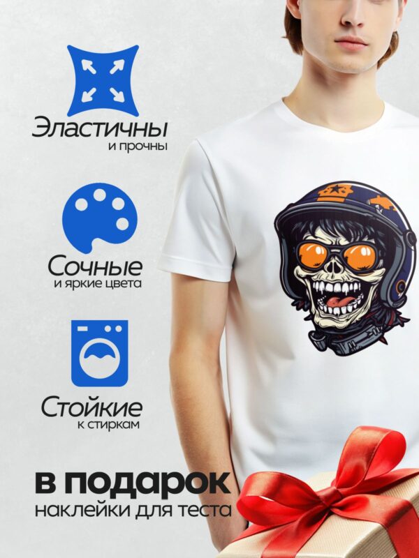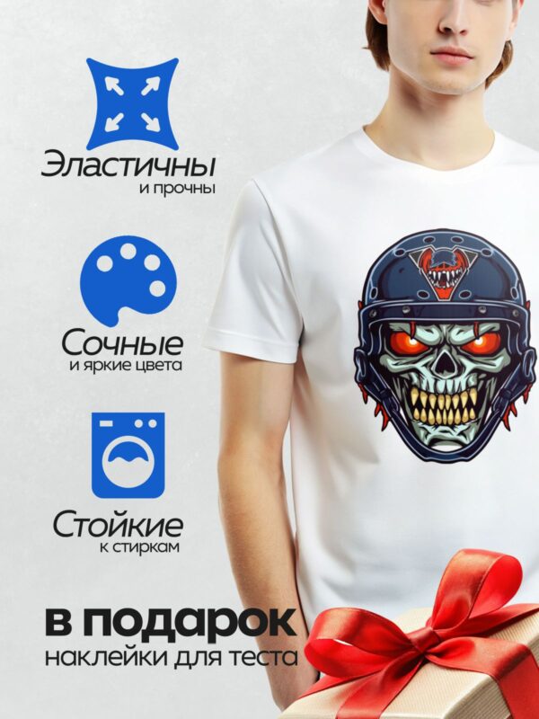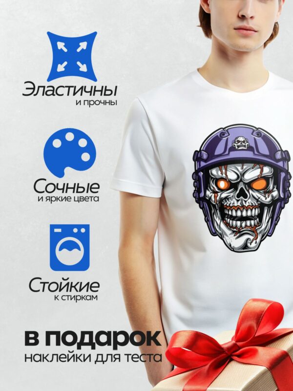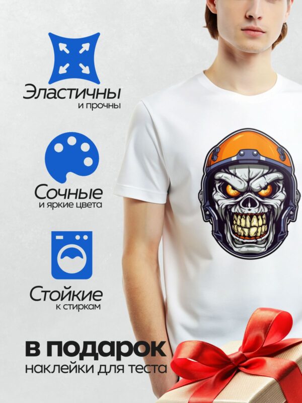 Термонаклейка на одежду DTF / Стилизованный череп в шлеме с оранжевыми очками.