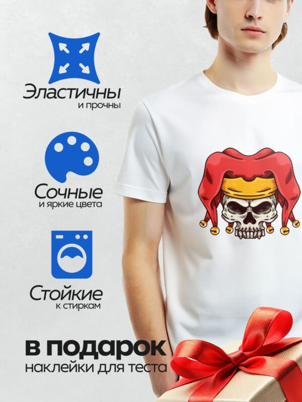 Термонаклейка на одежду DTF / Череп в шляпе шута с яркими красными элементами.
