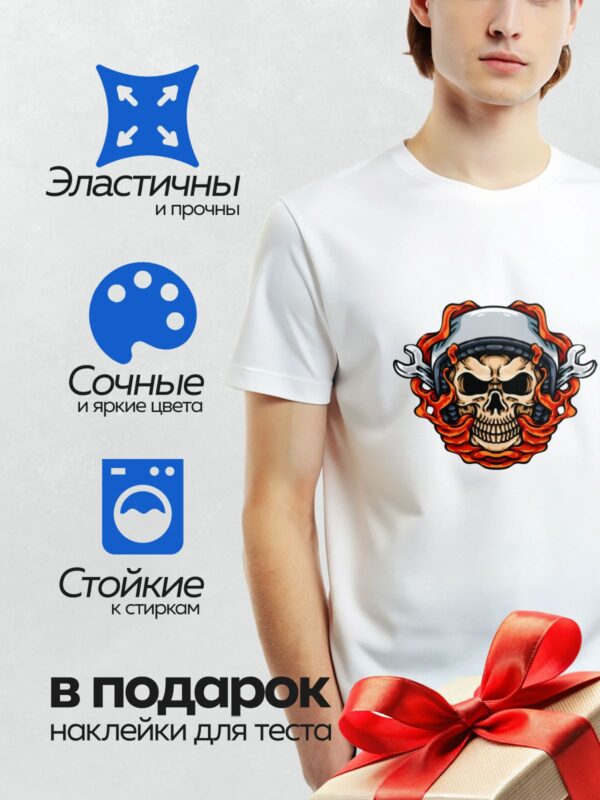 Термонаклейка на одежду DTF / Череп в мотоциклетном шлеме, окружённый пламенем.