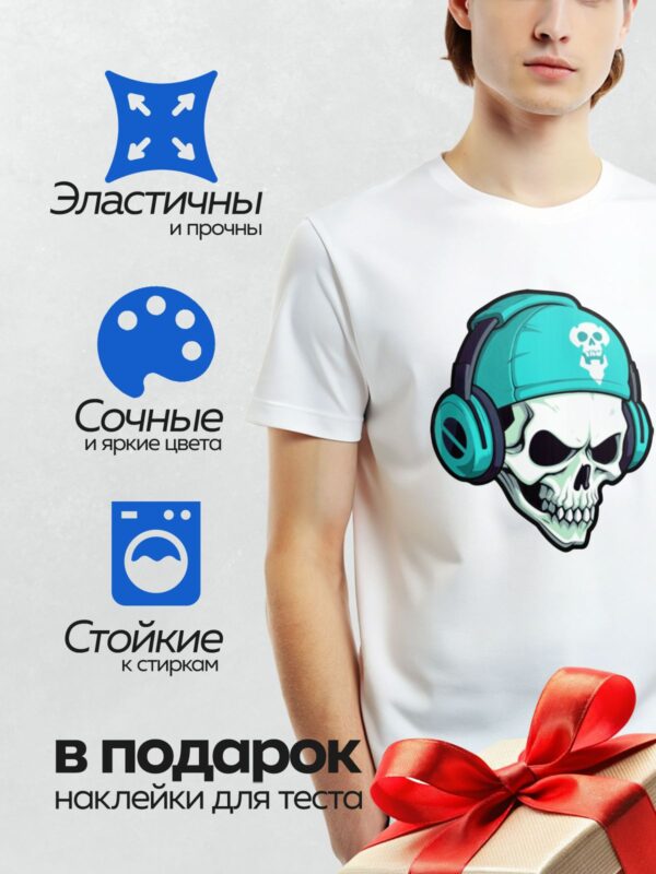 Термонаклейка на одежду DTF / Череп в наушниках и кепке с черепом.