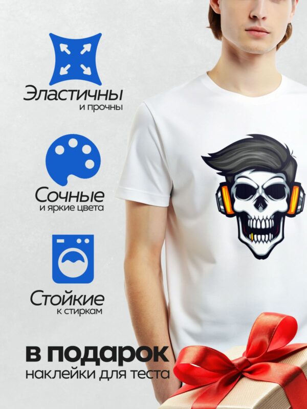 Термонаклейка на одежду DTF / Череп с модной прической и яркими наушниками.