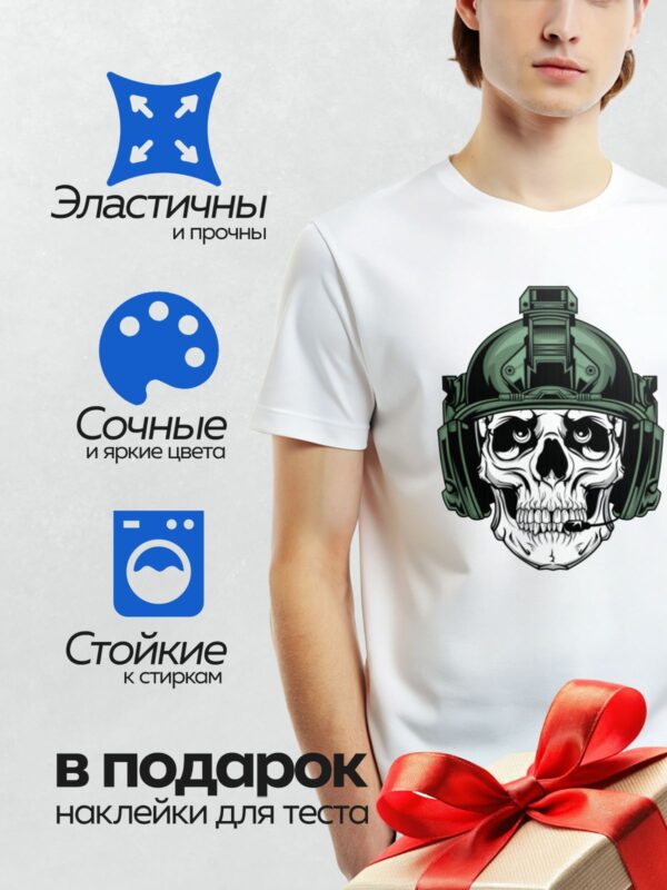Термонаклейка на одежду DTF / Стилизованный череп в тактическом шлеме, черно-белый рисунок.