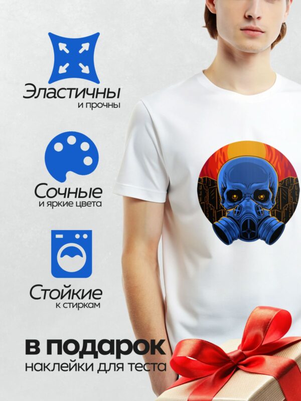 Термонаклейка на одежду DTF / Череп в противогазе на фоне горящего города.