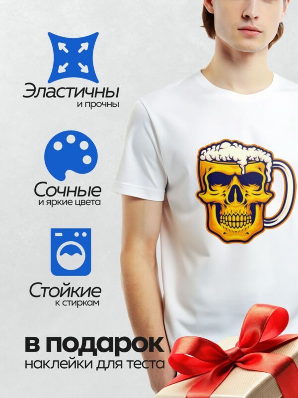Термонаклейка на одежду DTF / Яркий пивной череп с пеной и ручкой.