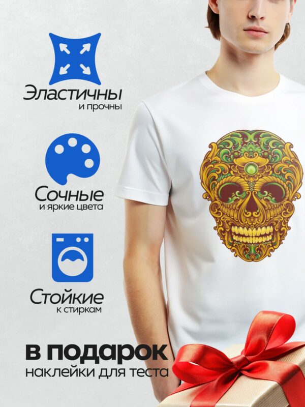 Термонаклейка на одежду DTF / Мексиканский череп в стиле барокко с яркими узорами.