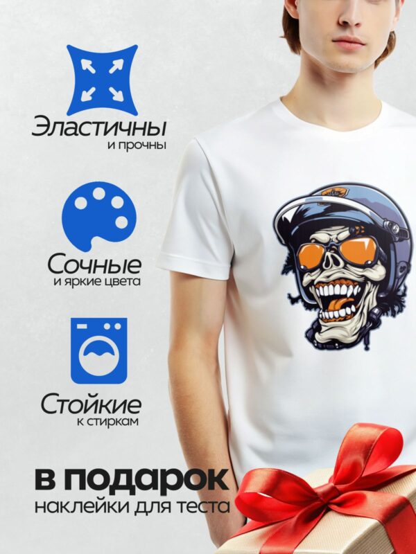 Термонаклейка на одежду DTF / Череп в мотоциклетном шлеме с оранжевыми очками.