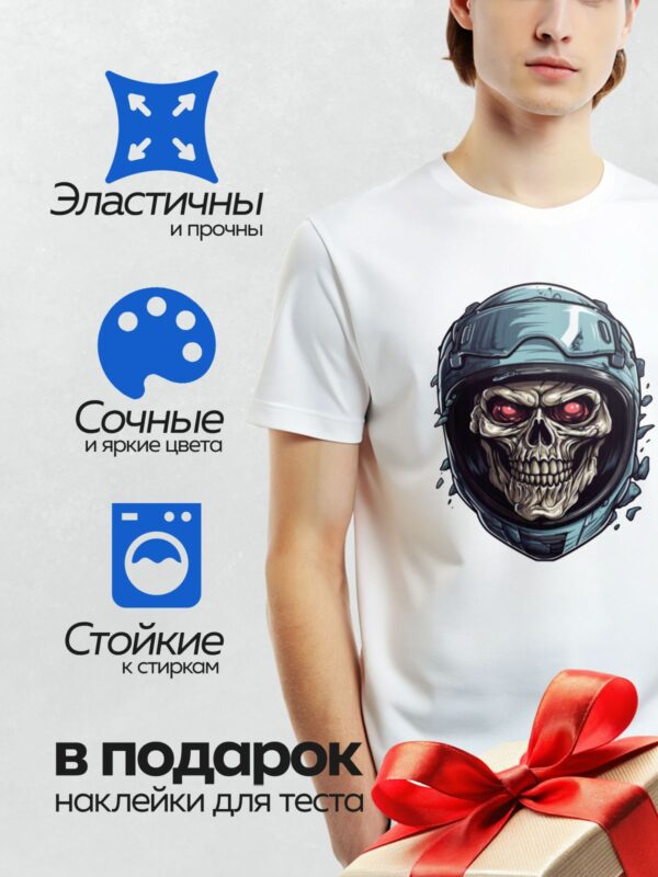 Термонаклейка на одежду DTF / Череп в шлеме с красными глазами и символом на лбу.