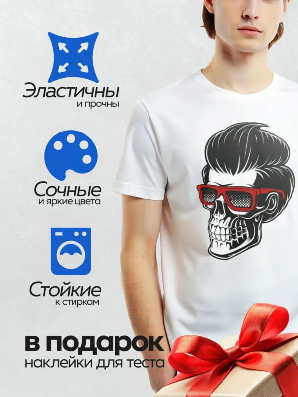Термонаклейка на одежду DTF / Череп с красными очками и прической помпадур.