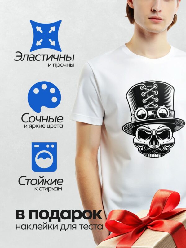 Термонаклейка на одежду DTF / Череп в цилиндре с усами и очками в стиле стимпанк.