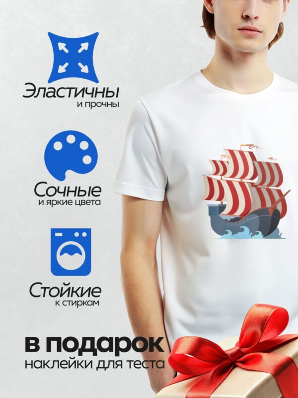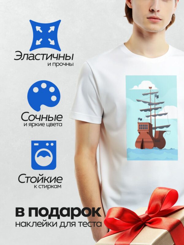 Термонаклейка на одежду DTF / Пиратский корабль с белыми парусами и красными флагами.