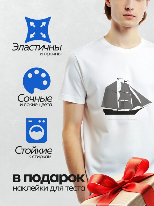 Термонаклейка на одежду DTF / На изображении показаны силуэты парусных кораблей, включая шхуну и бригантину. Шхуна имеет две мачты с косыми парусами, а бригантина — две мачты, где передняя мачта оснащена прямыми парусами, а задняя — косыми.