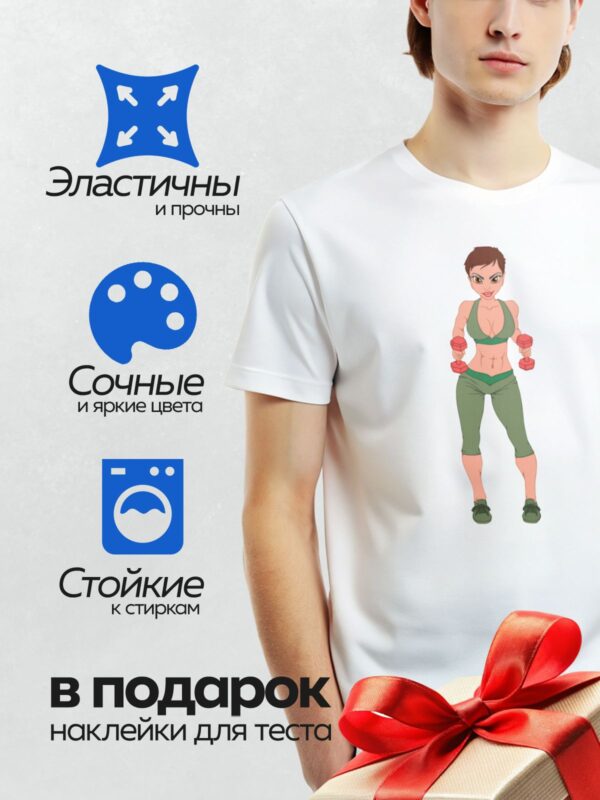 Термонаклейка на одежду DTF / Мультяшная девушка с гантелями в спортивной форме.