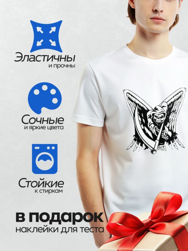 Термонаклейка на одежду DTF / Череп в капюшоне с крыльями, черно-белый стиль.
