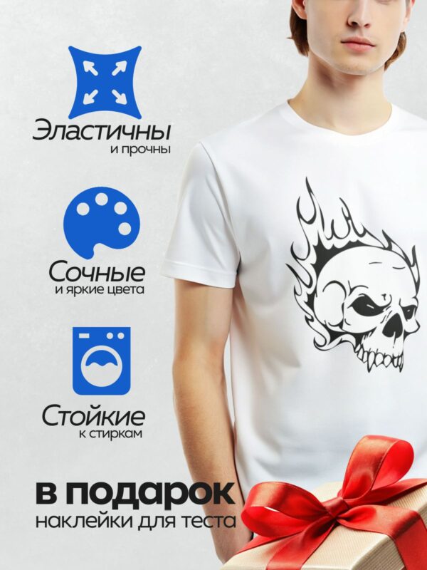 Термонаклейка на одежду DTF / Череп в огне, стилизованный черно-белый арт.