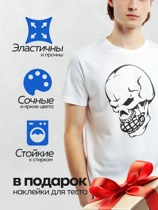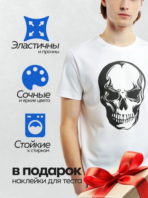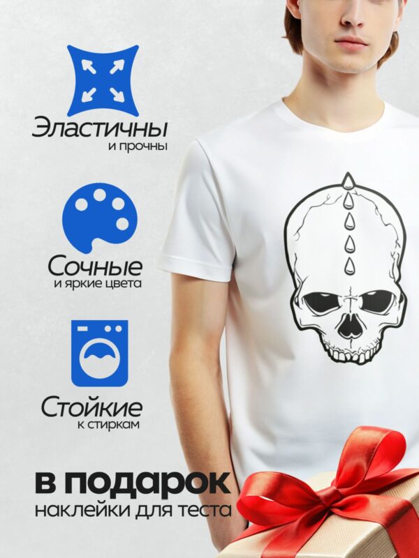Термонаклейка на одежду DTF / Стилизованный череп с каплями на лбу, черно-белый.