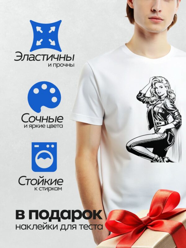 Термонаклейка на одежду DTF / Девушка в стиле пин-ап, кожаная куртка, уверенная поза.