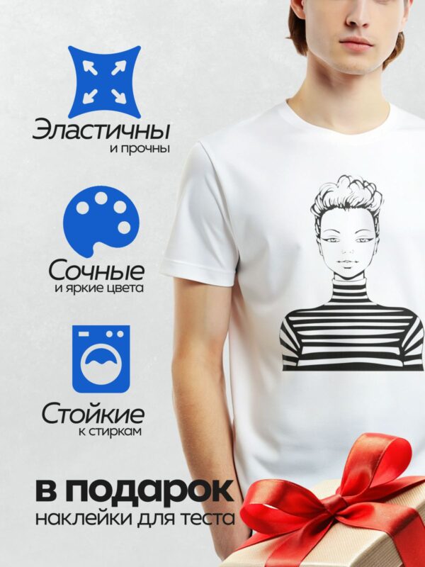 Термонаклейка на одежду DTF / Девушка в полосатом свитере, контурный стиль, акцент на глаза.