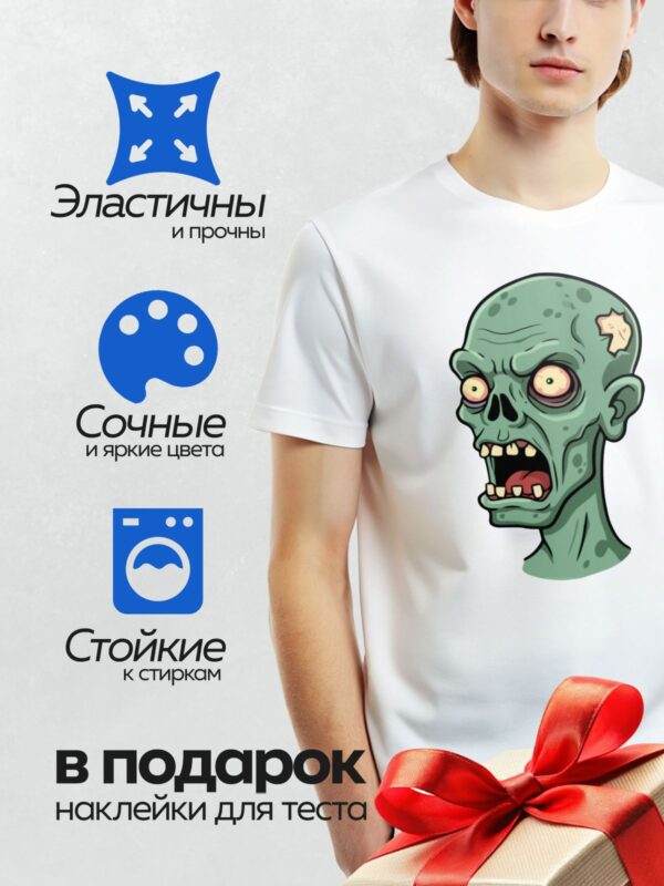 Термонаклейка на одежду DTF / Мультяшный зомби с зелёной кожей и жёлтыми глазами.