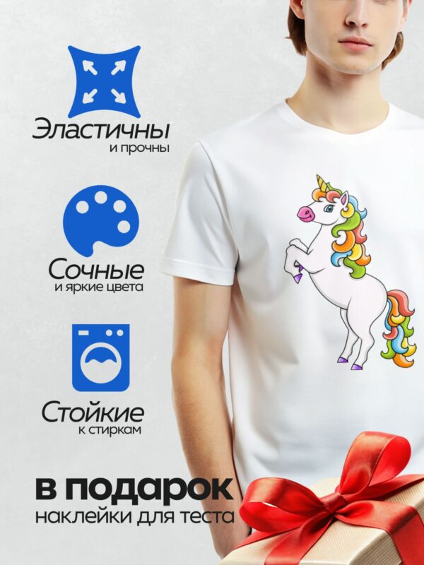 Термонаклейка на одежду DTF / Мультяшный единорог с радужной гривой делает “дэббинг”.