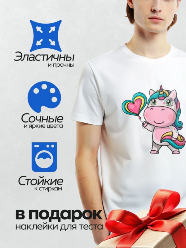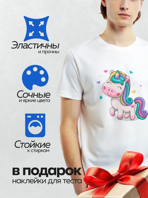 Термонаклейка на одежду DTF / Мультяшный единорог с яркими разноцветными узорами.