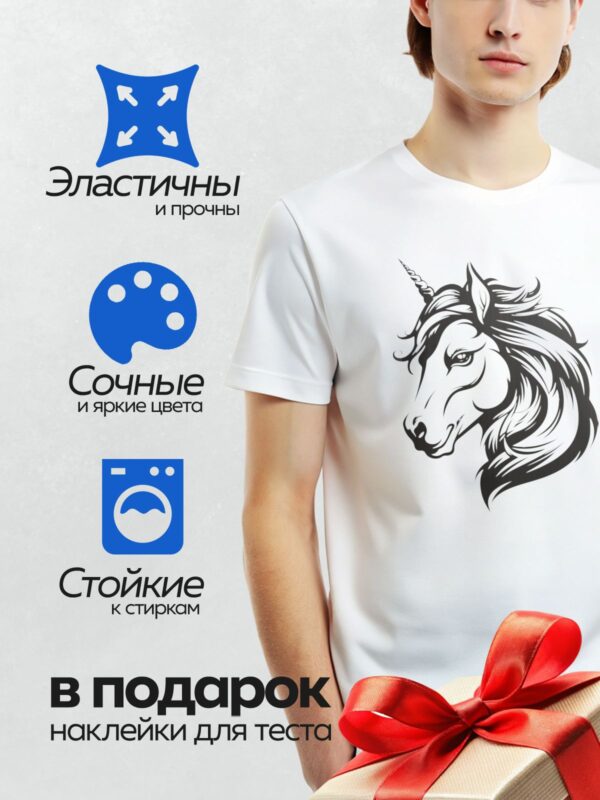 Термонаклейка на одежду DTF / Черно-белый единорог с изящной гривой.