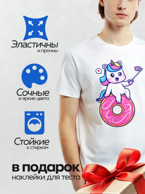 Термонаклейка на одежду DTF / Единорог с радужной гривой сидит на розовом пончике и делает селфи.