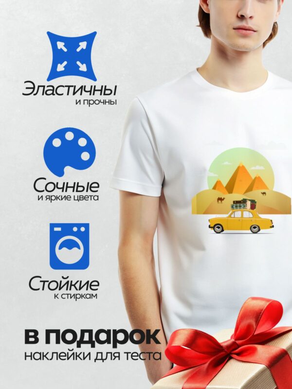 Термонаклейка на одежду DTF / Жёлтое такси, чемоданы, верблюды, пирамиды на фоне.