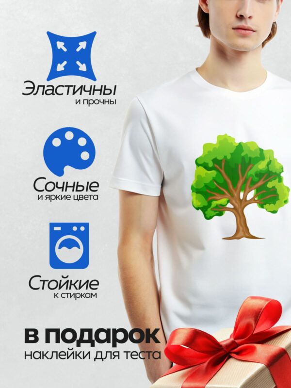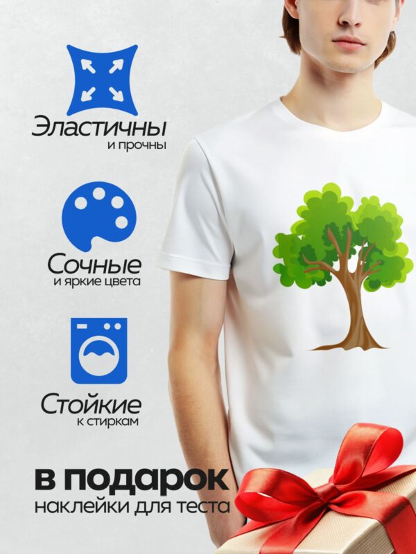 Термонаклейка на одежду DTF / На изображении показано дерево с густой кроной из зелёных листьев. Ствол дерева коричневый, с изгибом, а ветви раскидистые, создают ощущение тени и уюта.