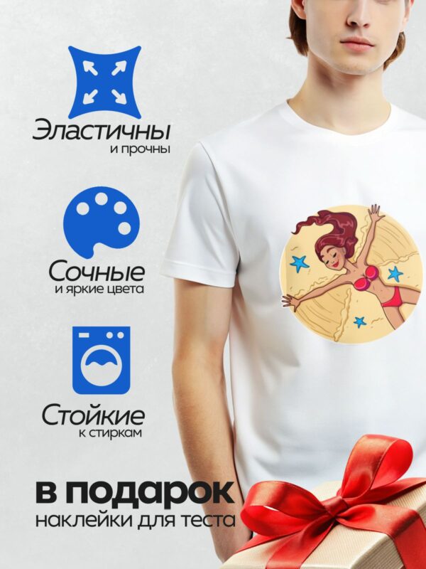 Термонаклейка на одежду DTF / Мультяшная девушка в красном купальнике на пляже, вокруг морские звезды.