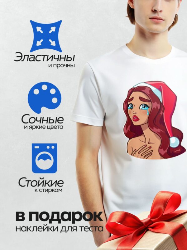 Термонаклейка на одежду DTF / Грустная девушка в шапке Санты, плачет.