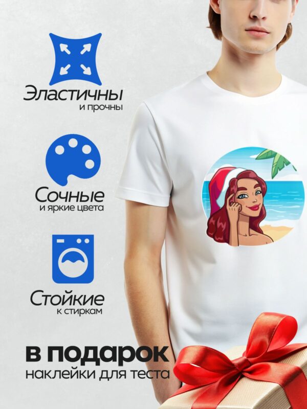 Термонаклейка на одежду DTF / Девушка в шапке Санты на фоне тропического пляжа.
