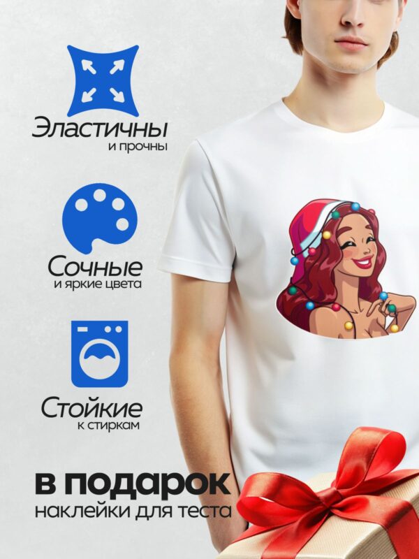 Термонаклейка на одежду DTF / Девушка с огоньками в волосах и шапкой Санты.