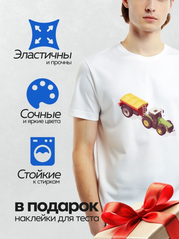 Термонаклейка на одежду DTF / Зелёный трактор с красной сеялкой на поле.