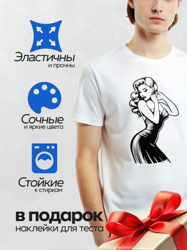 Термонаклейка на одежду DTF / Девушка в стиле пин-ап, волнистые волосы, облегающее платье.