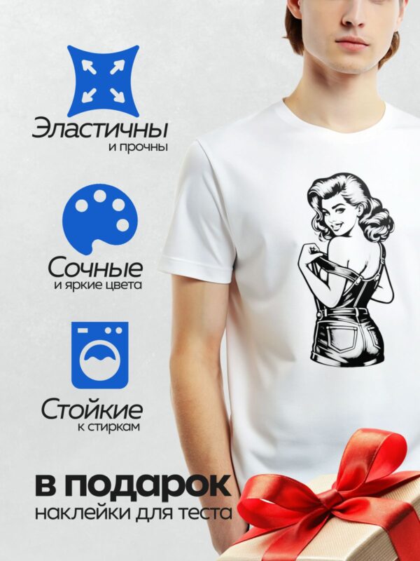 Термонаклейка на одежду DTF / Девушка в стиле пин-ап, ретро-прическа, джинсовый комбинезон.