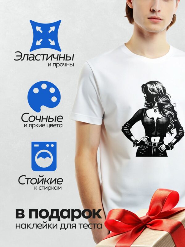 Термонаклейка на одежду DTF / Женский силуэт в стиле поп-арт: рубашка, шорты, длинные волосы.