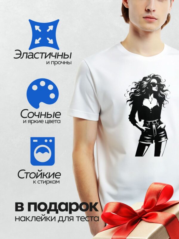 Термонаклейка на одежду DTF / Девушка в солнцезащитных очках, с длинными волнистыми волосами, в черной майке и шортах.